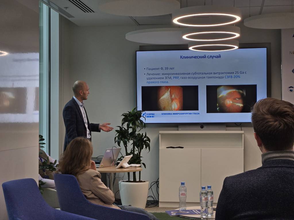 Заместитель начальника клиники, врач-офтальмолог, кандидат медицинских наук Евгений Юрьевич Шутько представил серию сложных клинических случаев с успешным хирургическим разрешением. Сообщение вызвало большой интерес, коллегами была подчеркнута оригинальность хирургического подхода и практическая значимость.